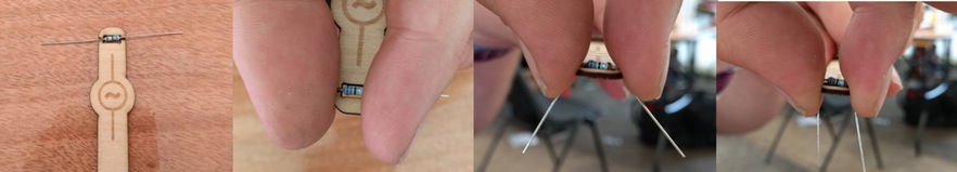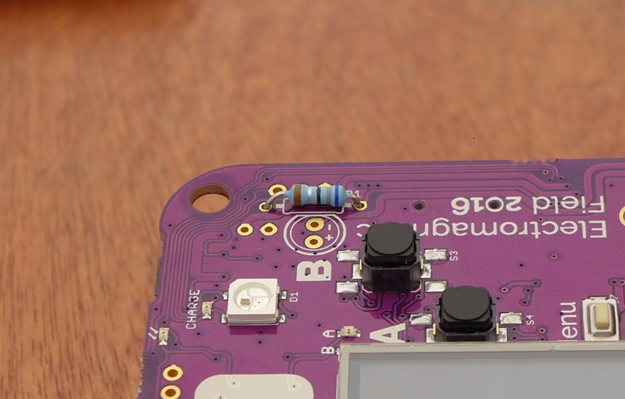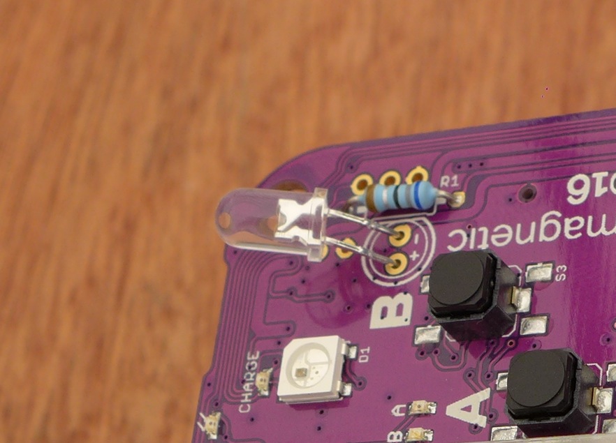You should have received an LED and a resistor with your badge. First, grab the resistor. Bend the legs over so they fit in the holes in the board, using the resistor lead bender.