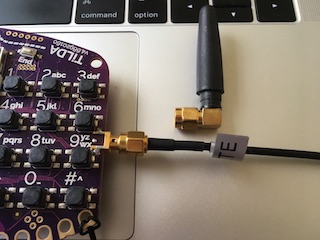 The cellular part of the badge seems to work (reliably) perfectly if an external antenna is used, such as a mag-mount with a length of coax. Seems to be an EMC issue, as using the pictured right angle antenna directly on the SMA does not work reliably. Time to get the Kapton tape and copper foil out...